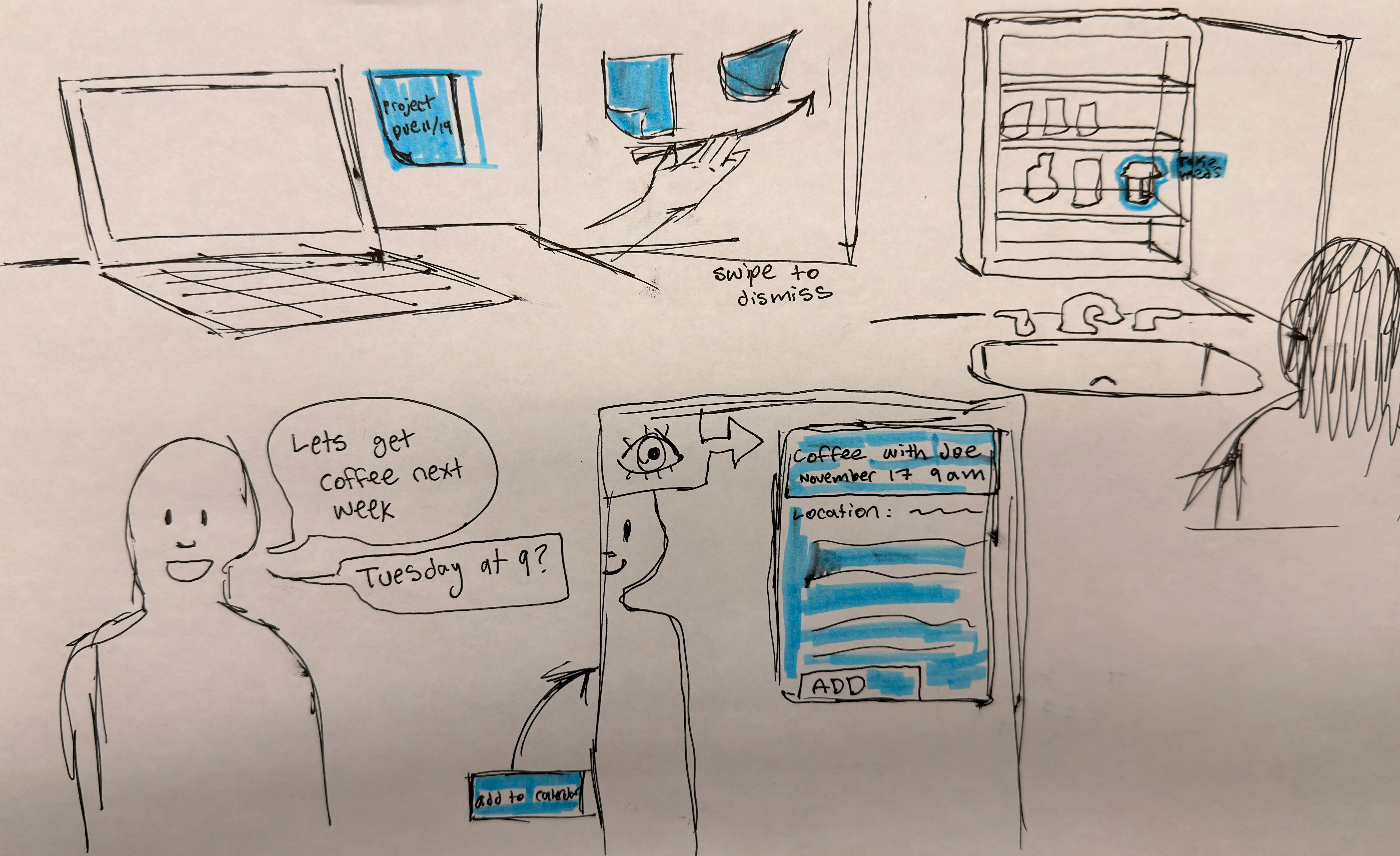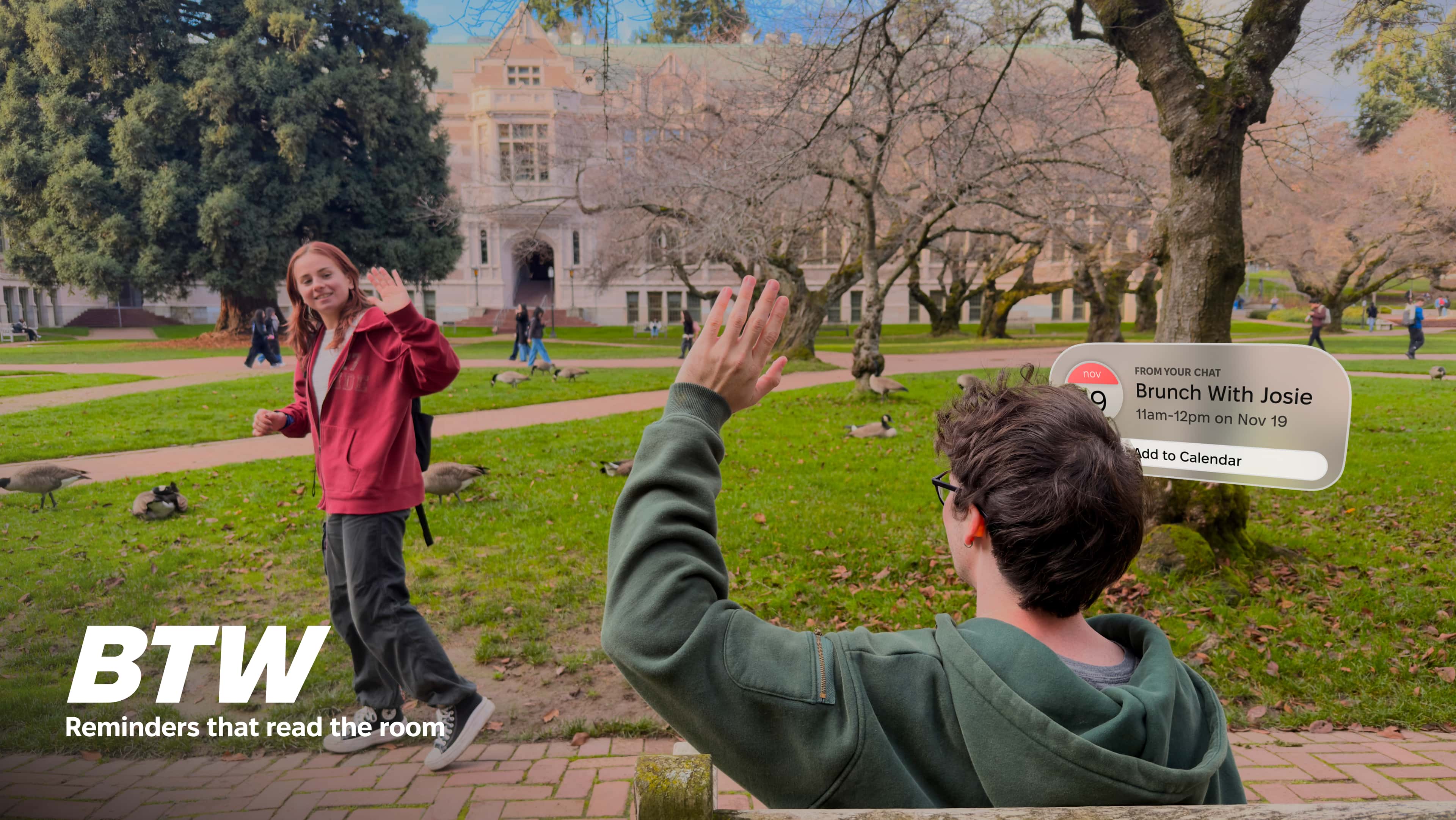 BTW runs quietly in the background until you need it. Reminders appear as subtle overlays physically anchored to relevant objects in your space. See a reminder floating by your daily meds? You know exactly what needs doing and where. The spatial connection removes the mental step of translating reminder to action and, more importantly, makes you far more likely to actually complete the task. You can act on reminders with a quick glance and a tap, or dismiss them with a wave.
