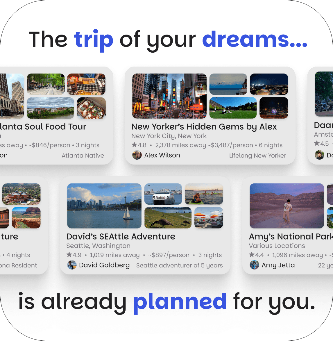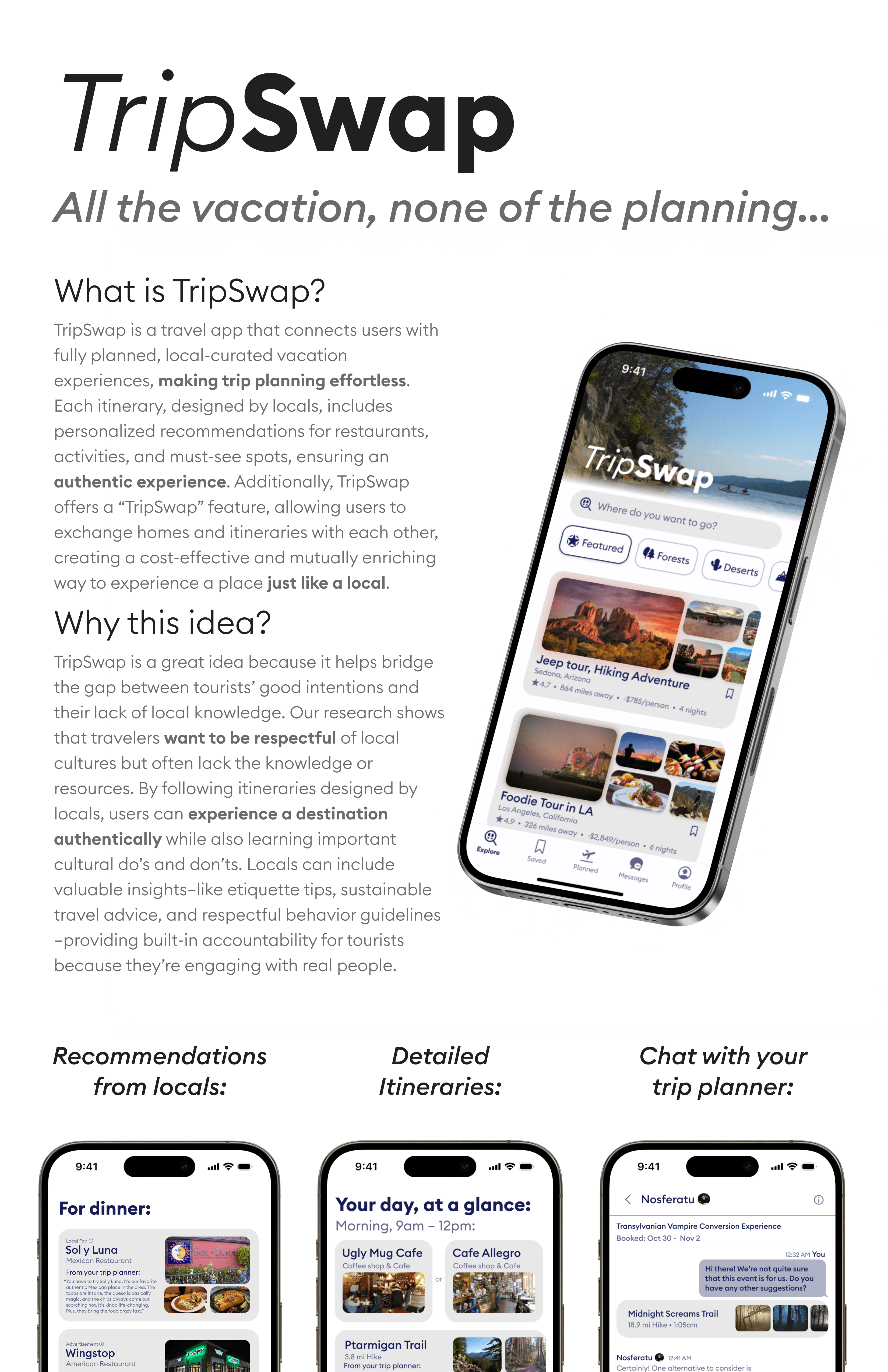 TripSwap is a travel app that makes vacation planning effortless by offering fully curated trips designed by locals. Users can browse and book unique itineraries for their chosen destination, with recommendations for restaurants, activities, and hidden gems. Each trip includes insider tips from locals, helping travelers experience a place authentically and respectfully while avoiding the stress of planning.