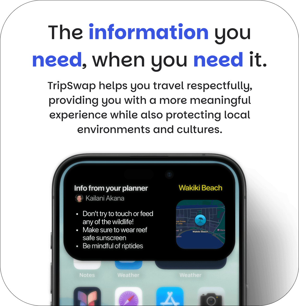 Before creating TripSwap, we surveyed tourists and locals in high-traffic areas like SeaTac airport and Pike Place Market to understand tourism-related challenges. We found that while travelers sought authentic experiences, they often lacked the knowledge to pursue these experiences respectfully, in ways that avoid harm to local economies and ecosystems.