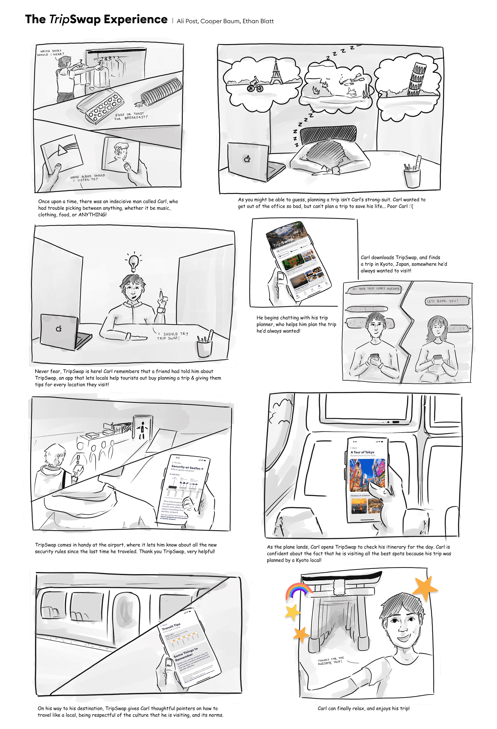 Storyboarding allowed us to visualize the end-to-end experience of actually using TripSwap, which helped us think about a number of nice-to-have's that we might add in future iterations.