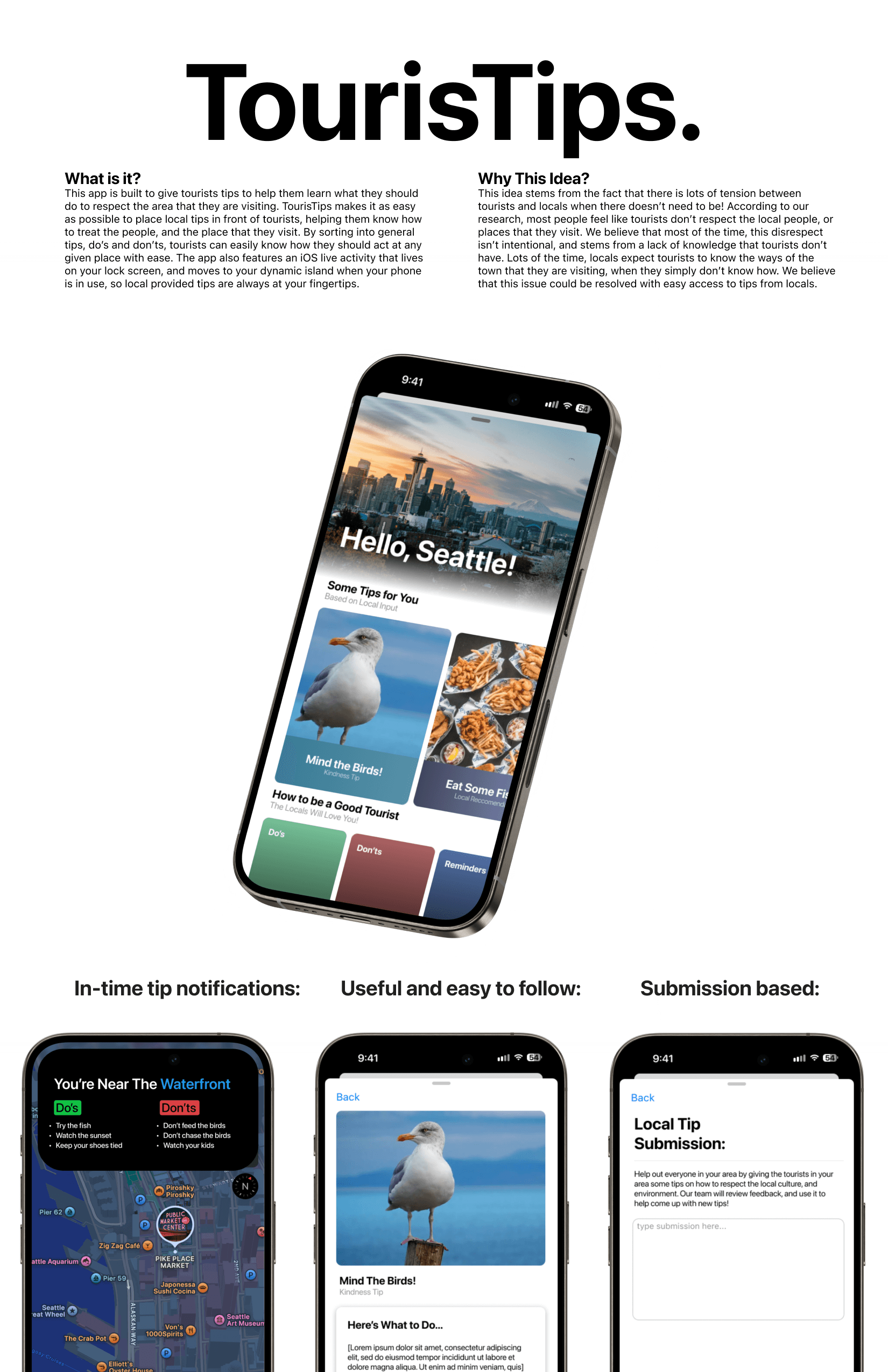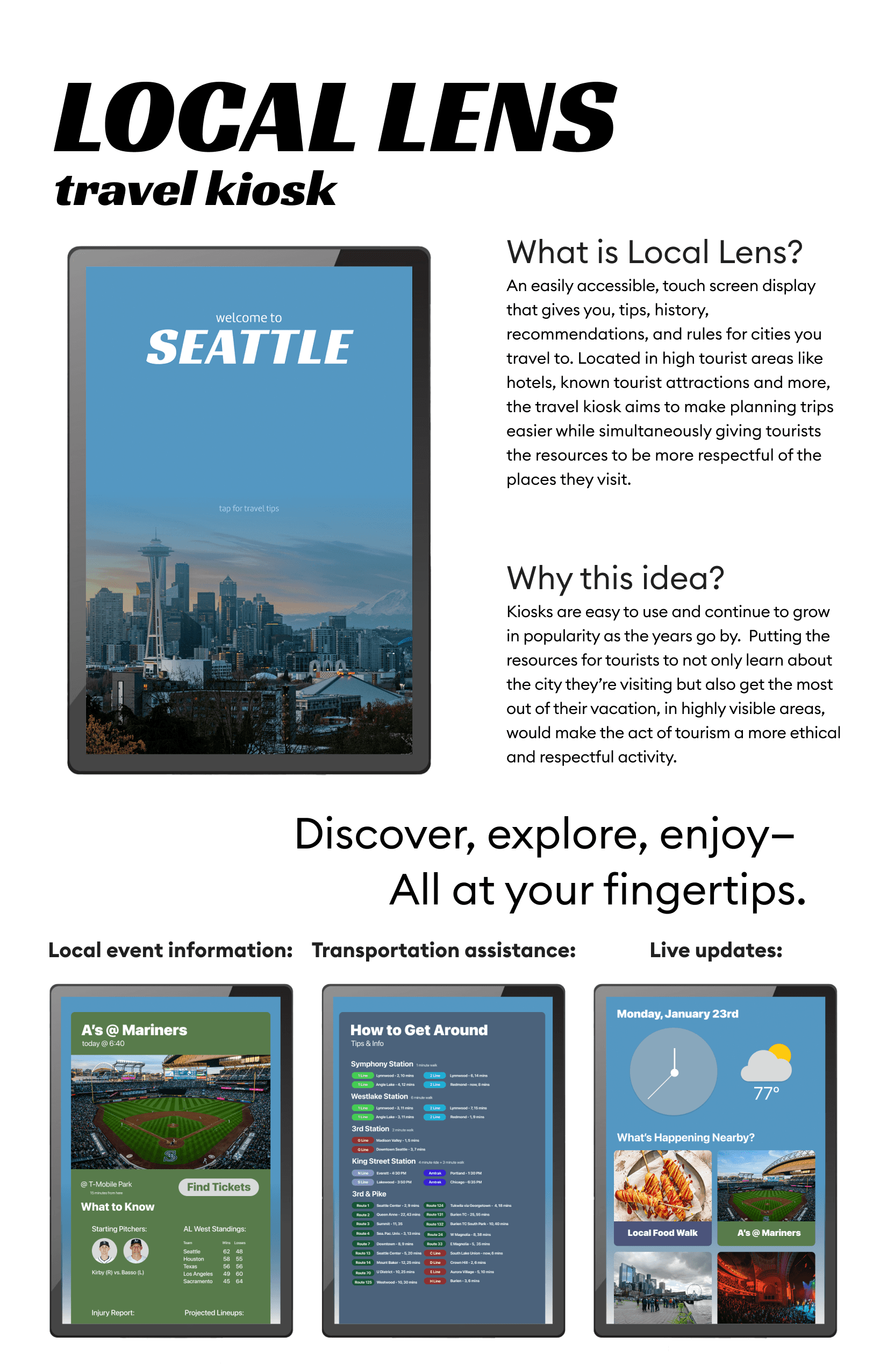Each of us picked our favorite of our own ideas and made a poster outlining the idea itself and why it aligns with our core goal of helping tourists explore destinations more authentically and respectfully. Cooper came up with TourisTips, Ali came up with Local Lens, and I created TripSwap