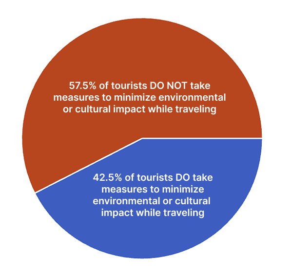 Similarly, 57.5% of tourists surveyed reported that they don’t take any measures to minimize their environmental or cultural impact while traveling. Common claims among tourists about their ability to minimize their negative impacts were:
