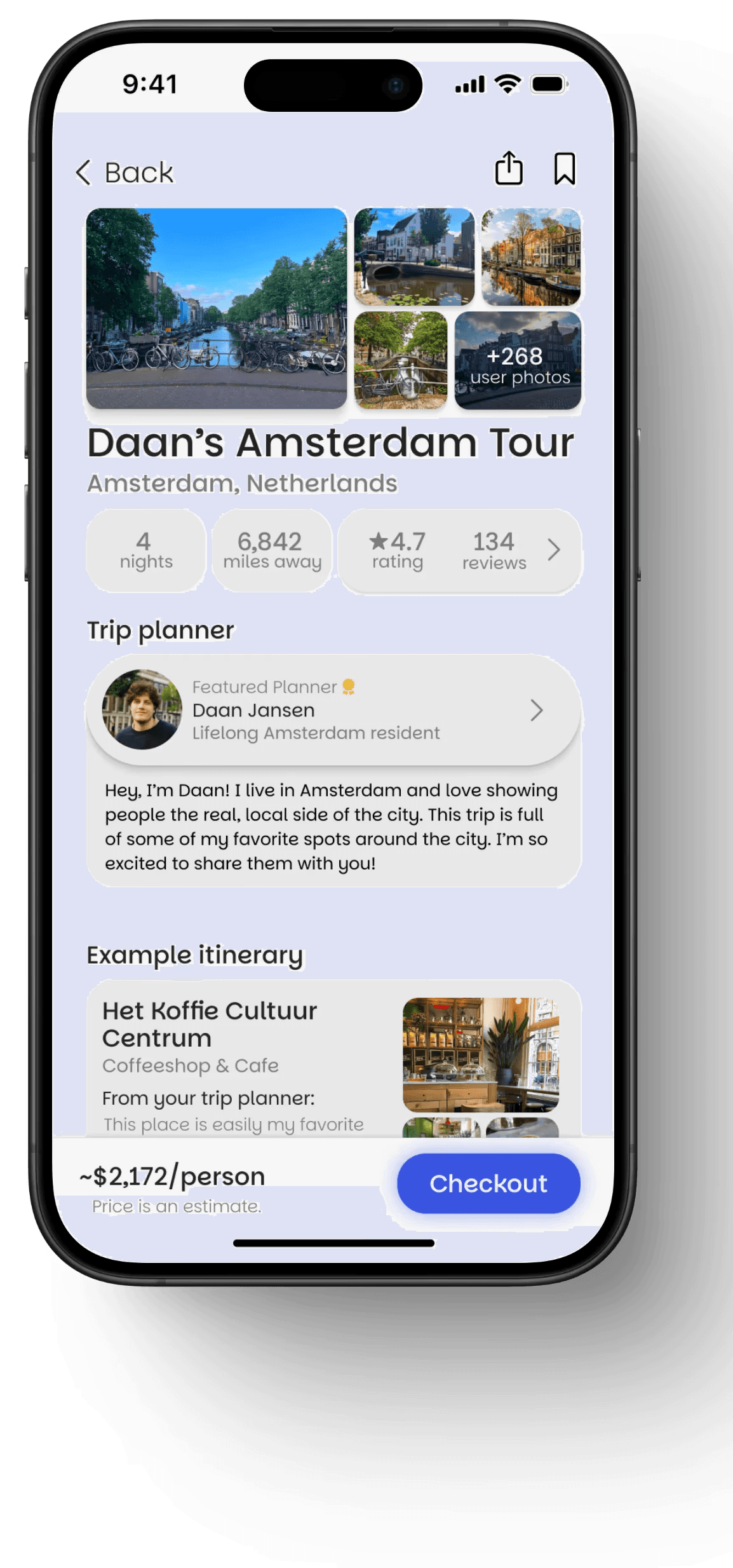 After all of our research, we arrived at our final design concept for TripSwap. At its core, TripSwap is a travel planning app that allows tourists to book fully planned trips created by locals from their destination. Locals get paid a flat fee by each tourist who chooses to go on their trip, and in return, the tourist is able to chat with their local for food recs, travel tips, and any other questions they might have about the location.